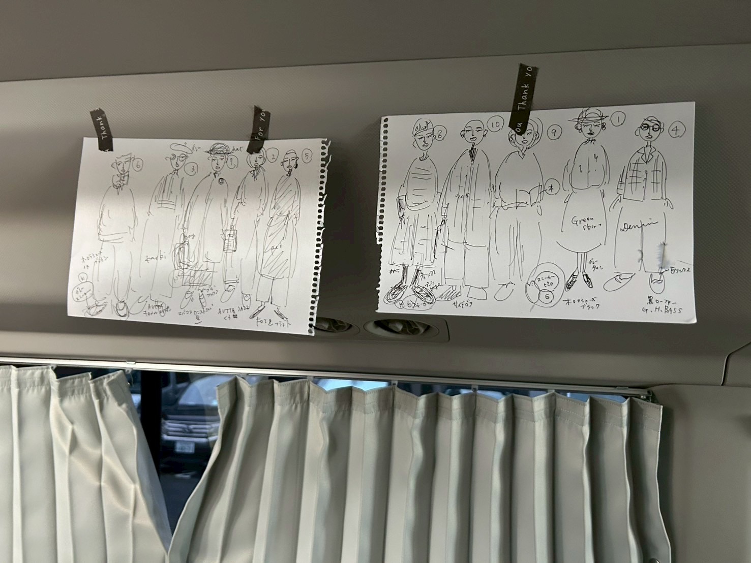 バスの壁に貼ってあったコーディネイトのイラストメモ。