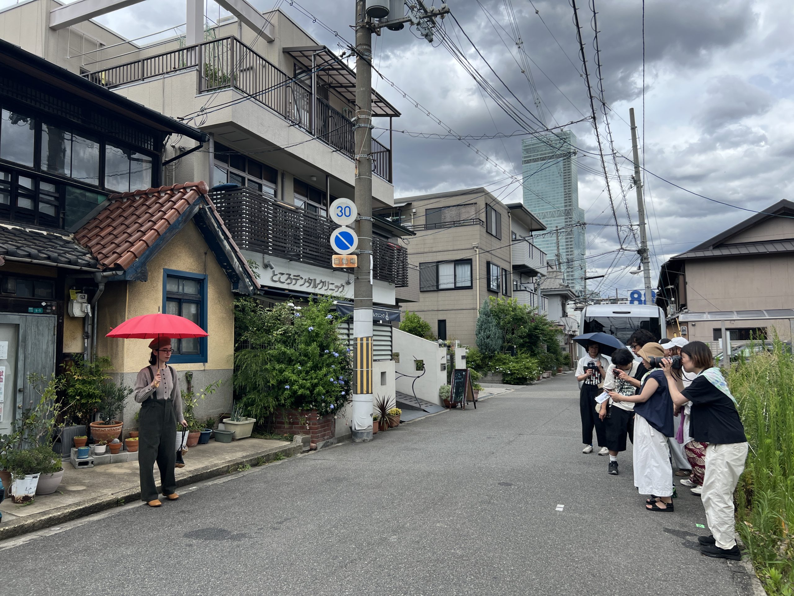 今回の撮影は、主に大阪のミナミのほうをまわりました。ロケバスの移動中、窓からみえる景色は、今と昔が混ざり合った大阪の町。