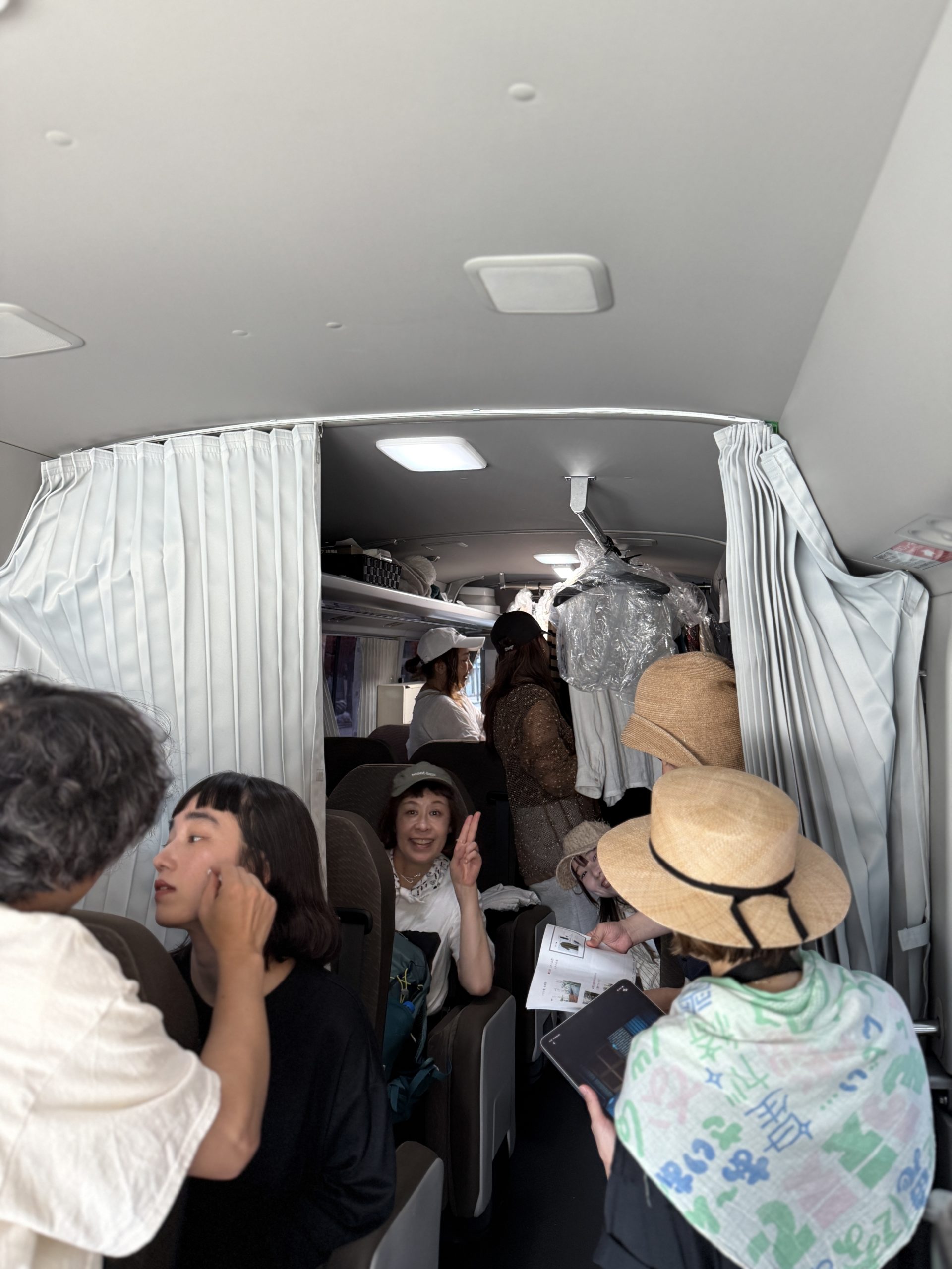 ロケバスの中。まんなかでピースしているのは、アトリエナルセパタンナーのなべさん。