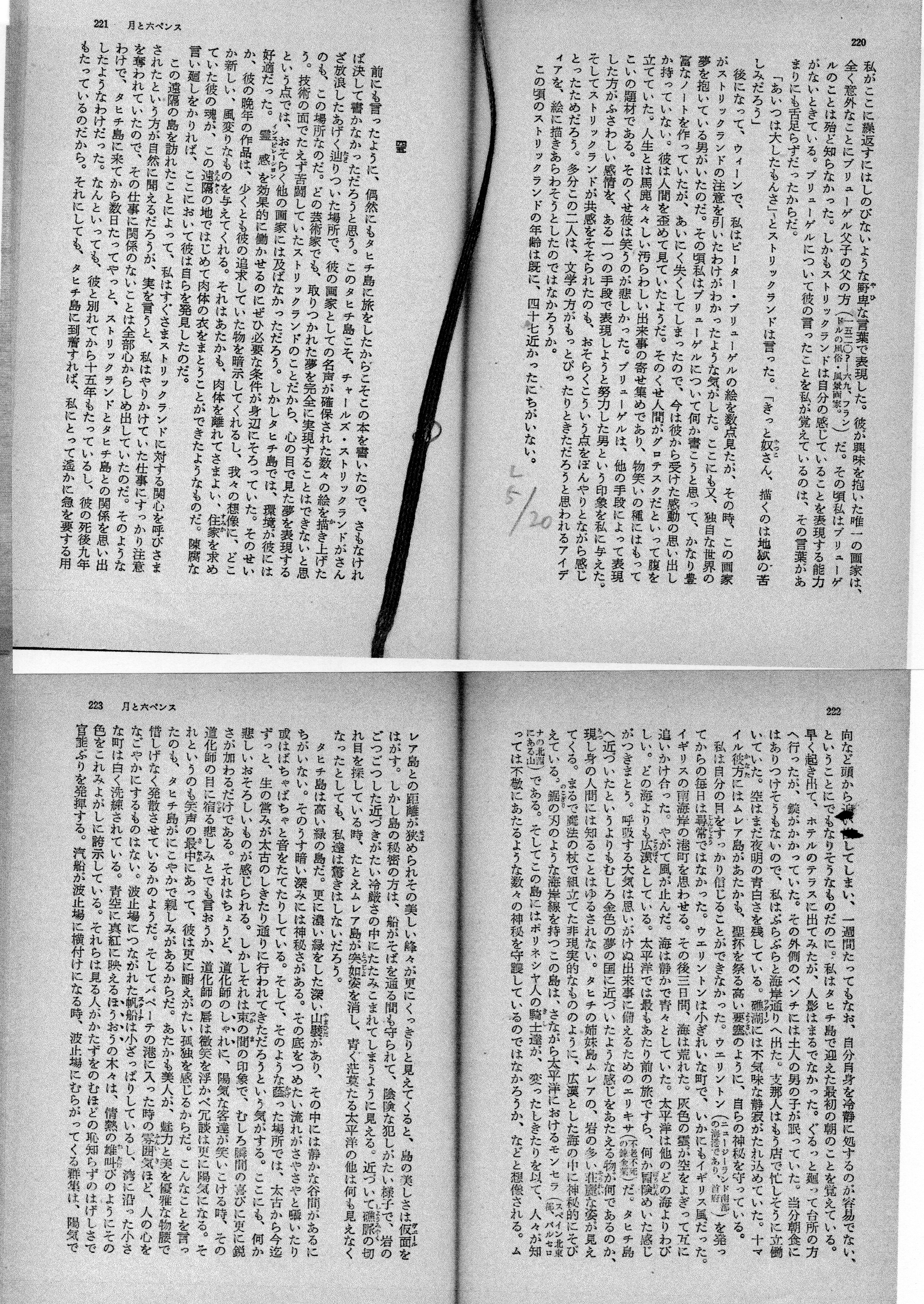 しかしタヒチ島では、環境が彼には好適だった。霊感を効果的に働かせるのにぜひ必要な条件が身辺にそろっていた。それはあたかも、肉体を離れてさまよい、住みかを求めていた彼の魂が、この遠隔の地ではじめて肉体の衣をまとうことができたようなものだ。陳腐な言い廻しをかりれば、ここにおいて自らを発見したのだ。彼とわかれてから15年もたっていた。