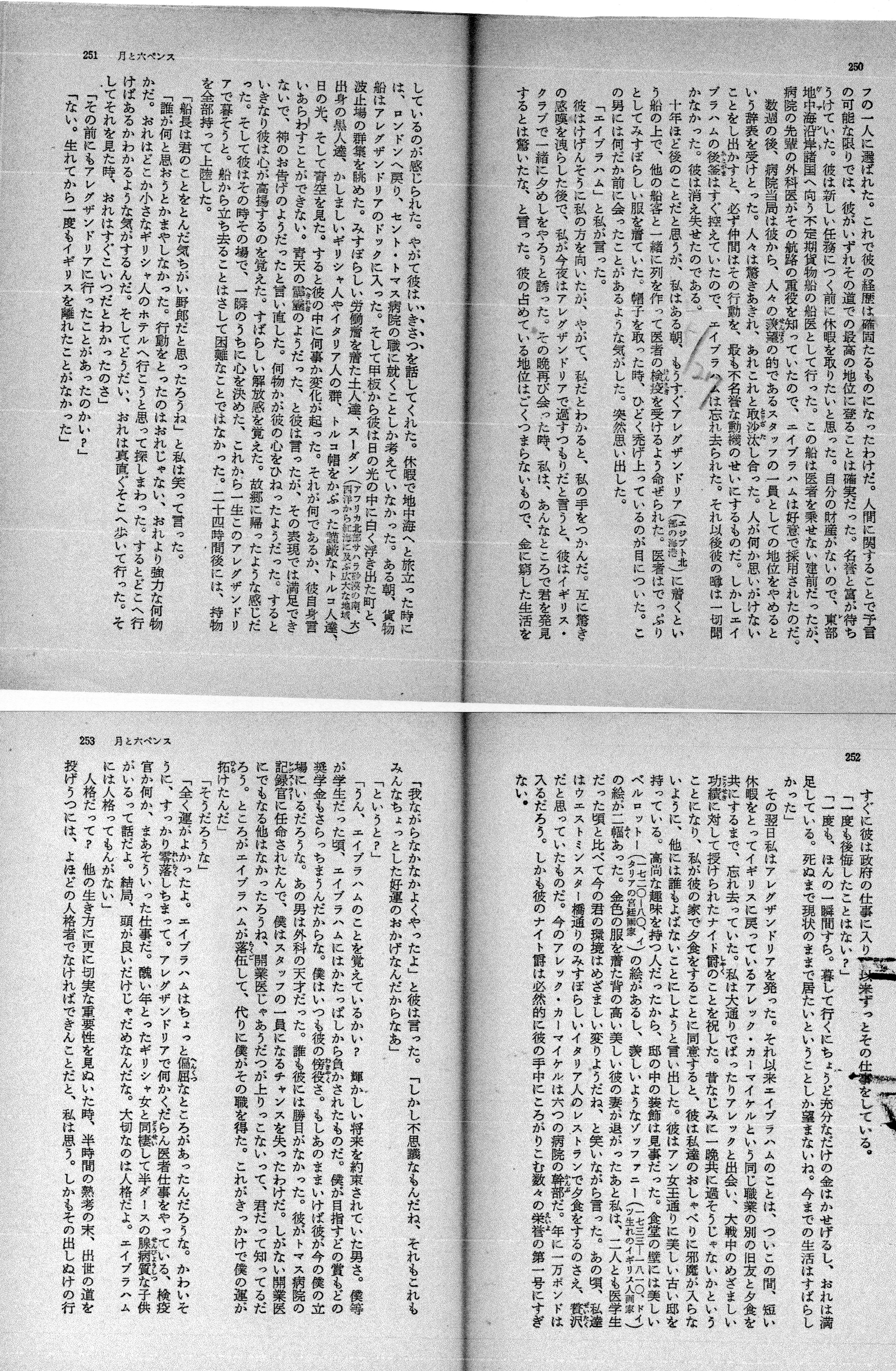 エイブラハムに出会った。船はアレキサンドリアのドックに入った。そしてその甲板から彼は日の光の中に白く浮き出た町と、波止場の群衆を眺めた。みすぼらしい労働着を着た土人達、スーダン出身の黒人達、かしましいギリシャ人やイタリア人の群、トルコ帽をかぶった謹厳なトルコ人達、日の光、そして青空を見た。すると彼の中に何事か変化が起った。それが何であるか、彼自身言い現わすことができない。